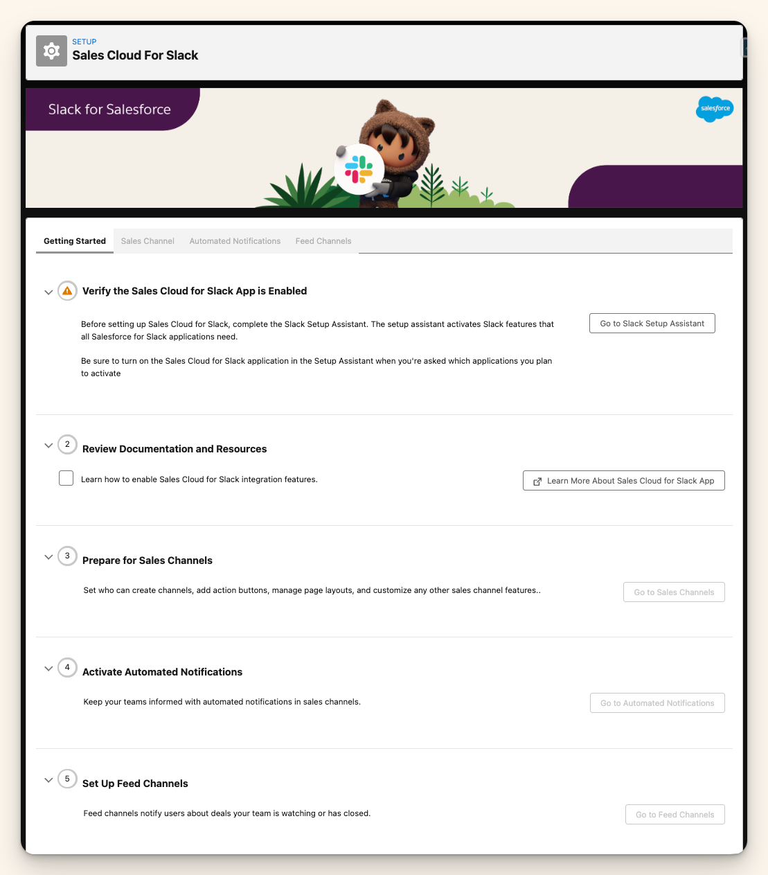 Setup lives in Salesforce Setup, then Slack. Your Slack admin approves the connection once. After that, each rep authenticates their own account and the integration is live within minutes.