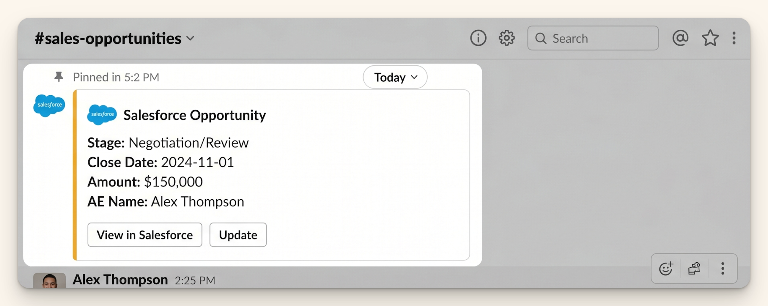 Yes. With Sales Cloud for Slack, reps can update Opportunity Stage, Amount, and Close Date directly from a Slack record preview card. The update writes to Salesforce in real time. This is the primary productivity benefit of the native integration: reps who live in Slack all day can update Salesforce without context-switching, which means your data is more likely to be current when you run your pipeline review.